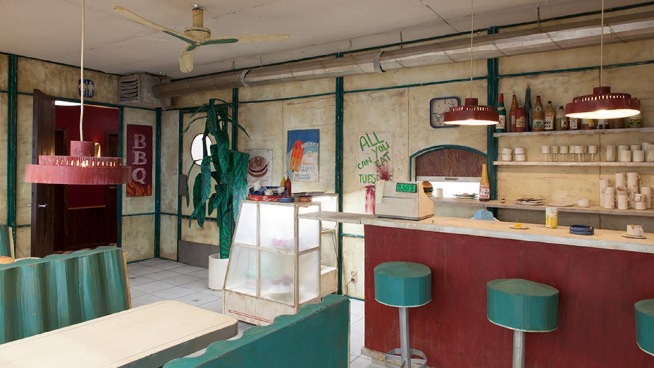 From storyboards to full-sized film sets, the artist’s show at Tim Van Laere, Antwerp, plays with cinematic techniques to make us believe in a constructed world