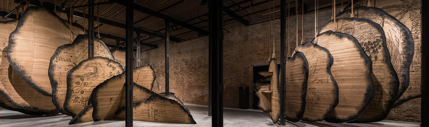 Main image: Manal AlDowayan, Shifting Sands: A Battle Song, 2024, installation view, Tussar silk, ink, acrylic paint. Courtesy: the Visual Arts Commission and the Commissioner for the National Pavilion of Saudi Arabia