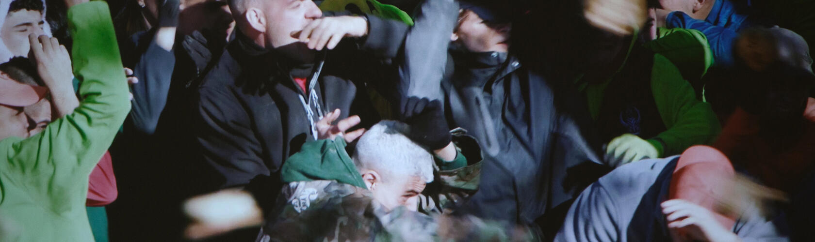 Afsah discovered the festival when in Spain making her previous film, Curro (2023). ‘I was fascinated by the fact that they are all throwing at one person,’ she tells me when I visit Molitor. Rather than focusing on the devil or el Jarramplas – whose name derives from the Spanish word arramplar meaning ‘to steal’ – the artist opted to train her camera exclusively on the movements of the turnip throwers. The crowd, often full of teenage boys, seems to relish in the violent nature of their task. ‘I’m interested in how people behave all together,’ Afsah says. ‘How do they use this setting once they’re given it?’